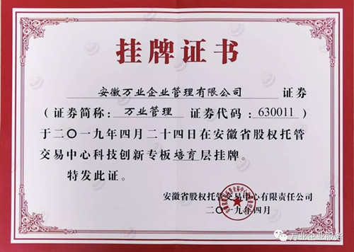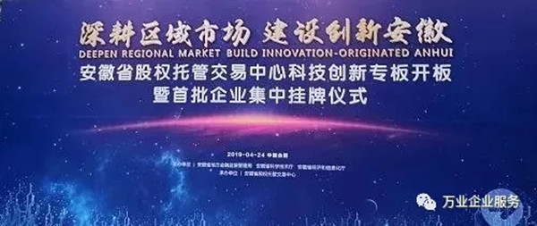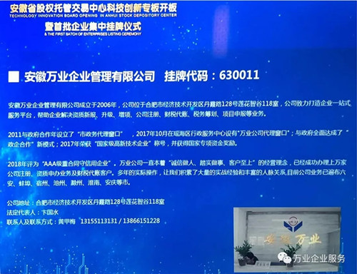 熱烈祝賀安徽萬業(yè)企業(yè)管理有限公司入駐 安徽省股交中心首批科創(chuàng)板企業(yè)?。?! 當(dāng)前,世界范圍內(nèi)正在孕育新一輪科技革命和產(chǎn)業(yè)變革,全球化競爭呈現(xiàn)出新的發(fā)展態(tài)勢,主要發(fā)達(dá)國家和創(chuàng)新型國家相繼出臺重大舉措,加快推動產(chǎn)業(yè)科技創(chuàng)新。 政策支持 2019年4月24日安徽《聚焦高新產(chǎn)業(yè)“硬科技”打造上市融資“孵化器”》安徽首批787家皖企掛牌科創(chuàng)專板在合肥濱湖新區(qū)圣盛大開板。省財(cái)政對在省股權(quán)托管交易中心科創(chuàng)板掛牌企業(yè)給予一次性獎補(bǔ)10萬元,完成改革并掛牌的再獎補(bǔ)10萬元,2年內(nèi)一共拿出3.3個(gè)億對企業(yè)實(shí)施獎補(bǔ),并鼓勵(lì)市、縣配套定制獎補(bǔ)政策。 “科創(chuàng)板”介紹 科創(chuàng)板是由國家主席習(xí)近平于2018年11月5日在首屆中國國際進(jìn)口博覽會開幕式上宣布設(shè)立,是獨(dú)立于現(xiàn)有主板市場的新設(shè)板塊,并在該板塊內(nèi)進(jìn)行注冊制試點(diǎn)。 萬業(yè)公司簡介 安徽萬業(yè)企業(yè)管理有限公司成立于2006年。萬業(yè)公司一直本著“誠信做人、踏實(shí)做事、客戶至上”的經(jīng)營理念,已經(jīng)成功辦理上萬家公司注冊、資質(zhì)申辦業(yè)務(wù)及財(cái)稅代賬客戶上千家。多年的實(shí)際操作,讓我們積累了大量的實(shí)戰(zhàn)經(jīng)驗(yàn)和豐富的人脈關(guān)系,公司擁有一批精通建筑業(yè)資質(zhì)申報(bào)知識、精通工商稅務(wù)行業(yè)及項(xiàng)目申報(bào)等專業(yè)精英。 安徽萬業(yè)掛牌 2019年4月24日這一天,安徽萬業(yè)企業(yè)管理有限公司成功入駐安徽省股交中心首批科創(chuàng)板企業(yè),掛牌證券代碼:630011,這是值得被紀(jì)念的一天,是一個(gè)新的歷史上的里程碑! 愿景 萬業(yè)公司將站在一個(gè)更高的平臺與殊譽(yù),致力于做好企業(yè)一站式服務(wù)平臺——所有平臺內(nèi)的業(yè)務(wù)將“一對一”客服經(jīng)理專業(yè)對接,一直追求與客戶建立長期穩(wěn)定的合作伙伴關(guān)系,為客戶提供熱誠、快捷、周到的服務(wù)! 企業(yè)一站式服務(wù)平臺 長按,識別二維碼,加關(guān)注 工商注冊、財(cái)稅代賬、審計(jì)評估、財(cái)務(wù)咨詢、商標(biāo)專利、資質(zhì)審批、人才獵頭、人才報(bào)名、金融保險(xiǎn)、信用評級、法務(wù)咨詢、項(xiàng)目申報(bào) 公司網(wǎng)站:www.guardq.cn 聯(lián)系方式:400-0551-976 合肥總部:安徽省合肥市南一環(huán)與馬鞍山路交口恒興廣場A座24樓 分部:合肥市行政服務(wù)中心一樓“萬業(yè)公司代理窗口”(工商局窗口正對面) 分部:合肥市瑤海區(qū)行政服務(wù)中心一樓“萬業(yè)公司代理窗口”(工商局窗口正對面) 蕪湖分部:蕪湖市鏡湖區(qū)偉星時(shí)代金融中心610室 (申經(jīng)理:189-0560-8966)