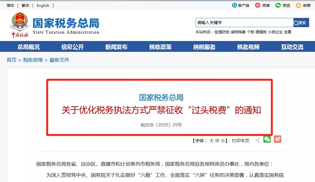 國家稅務總局 關于優(yōu)化稅務執(zhí)法方式嚴禁征收“過頭稅費”的通知 稅總發(fā)〔2020〕29號 國家稅務總局各省、自治區(qū)、直轄市和計劃單列市稅務局,國家稅務總局駐各地特派員辦事處,局內各單位: 為深入貫徹黨中央、國務院關于扎實做好“六穩(wěn)”工作、全面落實“六保”任務的決策部署,認真落實國務院常務會議有關精神,進一步提升政治站位,充分發(fā)揮稅收職能作用,統(tǒng)籌推進疫情防控和支持經濟社會發(fā)展,現就優(yōu)化稅務執(zhí)法方式、嚴禁征收“過頭稅費”有關要求進一步強調如下: 一、堅決防止違規(guī)征稅收費 各級稅務機關要進一步堅持依法規(guī)范組織收入原則不動搖,堅決壓實主體責任,嚴禁征收“過頭稅費”、違規(guī)攬稅收費以及以清繳補繳為名增加市場主體不合理負擔。堅決不搞大規(guī)模集中清欠、大面積行業(yè)檢查,堅決禁止采取空轉、轉引稅款等手段虛增收入。建立健全稅費收入質量監(jiān)控和分析機制,利用大數據完善分區(qū)縣、分稅種、分時段的收入實時監(jiān)控體系,對收入畸高畸低等異常情況,及時分析排查,發(fā)現違法違規(guī)行為一律嚴肅處理,并建立典型案例通報制度,強化以案示警的作用。要積極向地方黨委、政府和相關部門匯報,進一步爭取對依法依規(guī)組織稅費收入的支持,避免采取不當的組織收入措施。上級稅務部門要加強對下級稅務部門組織收入工作的監(jiān)督指導,想方設法幫助其化解征收工作面臨的矛盾和壓力。 二、不斷改進稅收風險管理 健全事前事中事后全流程稅收風險管理運行機制,進一步完善基于大數據的“雙隨機、一公開”“信用+風險”監(jiān)管方式,切實增強稅收風險管理的針對性和有效性,既有效防范和打擊偷騙稅行為,又盡最大可能不影響企業(yè)正常生產經營。統(tǒng)籌發(fā)揮好稅收風險管理服務自主遵從和規(guī)范稅收秩序的功能,以服務為導向,強化事前精準提示提醒,不得組織對某一行業(yè)開展多年期、撒網式的風險推送和自查補繳稅費,重視和保障納稅人、繳費人對推送風險的自訴權益,促進其及時補正、精準糾錯,避免違法違規(guī)風險;以規(guī)范為目的,強化事中精準控制、事后精準應對,嚴厲精準打擊“假企業(yè)”“假出口”“假申報”等涉稅違法行為,防止稅收流失,維護國家稅收安全。 三、積極支持新業(yè)態(tài)健康發(fā)展 主動適應新經濟不斷發(fā)展的新要求,持續(xù)完善支持電子商務、“互聯網+”等新興業(yè)態(tài)發(fā)展的稅收政策體系和管理服務措施,大力培育新興經濟增長點。繼續(xù)堅持包容審慎的原則,不得專門針對某一新興業(yè)態(tài)、新型商業(yè)模式,組織開展全面風險應對和稅務檢查。積極運用稅收大數據,深入分析線上經濟發(fā)展情況,完善精準化、精細化稅收服務和管理措施,促進線上線下融合,支持新興業(yè)態(tài)持續(xù)健康發(fā)展。 四、不折不扣落實稅費優(yōu)惠政策 進一步落實落細黨中央、國務院出臺的系列稅費優(yōu)惠政策,不斷鞏固和拓展政策實施成效。結合疫情防控,動態(tài)更新《支持疫情防控和經濟社會發(fā)展稅費優(yōu)惠政策指引》,及時通過“云課堂”、線上答疑等方式,回應稅收熱點問題,深入開展針對性政策解讀和輔導,助力納稅人、繳費人應享盡享。適時開展減稅降費督查,狠抓發(fā)現問題整改,強化跟蹤問效,暢通政策落實“最后一公里”,確保減稅降費政策紅利直達困難企業(yè)、直達市場主體。 五、持續(xù)優(yōu)化辦稅繳費服務 大力鞏固拓展“非接觸式”辦稅繳費服務,進一步擴大網上辦稅繳費事項范圍,確保主要辦稅繳費事項均能網上辦理。簡化優(yōu)化稅費申報手續(xù),加快推進增值稅、消費稅、城市維護建設稅主附稅合并申報和財產行為稅一體化納稅申報。繼續(xù)深化與銀保監(jiān)部門和銀行業(yè)金融機構的合作,搭建“稅銀互動”信息共享平臺,擴大受益范圍,增進線上辦理便利,更好滿足企業(yè)特別是民營企業(yè)和小微企業(yè)信貸需求,助力緩解市場主體融資難題。 六、切實轉變工作作風 各級稅務機關要根據經濟社會發(fā)展的新形勢新情況,創(chuàng)新工作思路和工作方式,不能用老辦法解決新問題,不能用泛泛的方法解決個性化的問題。要妥善處理好稅收與經濟社會發(fā)展的關系,準確把握稅務執(zhí)法的時度效,提高工作的精準性和精細度,防止粗放式管理和執(zhí)法。要通過12366納稅服務熱線、稅務網站等渠道和實地走訪、第三方調查等方式,深入開展向納稅人、繳費人問需活動,積極幫助紓困解難,及時回應社會關切,以作風建設的新成效,促進稅收工作質效新提升。 國家稅務總局 2020年6月18日